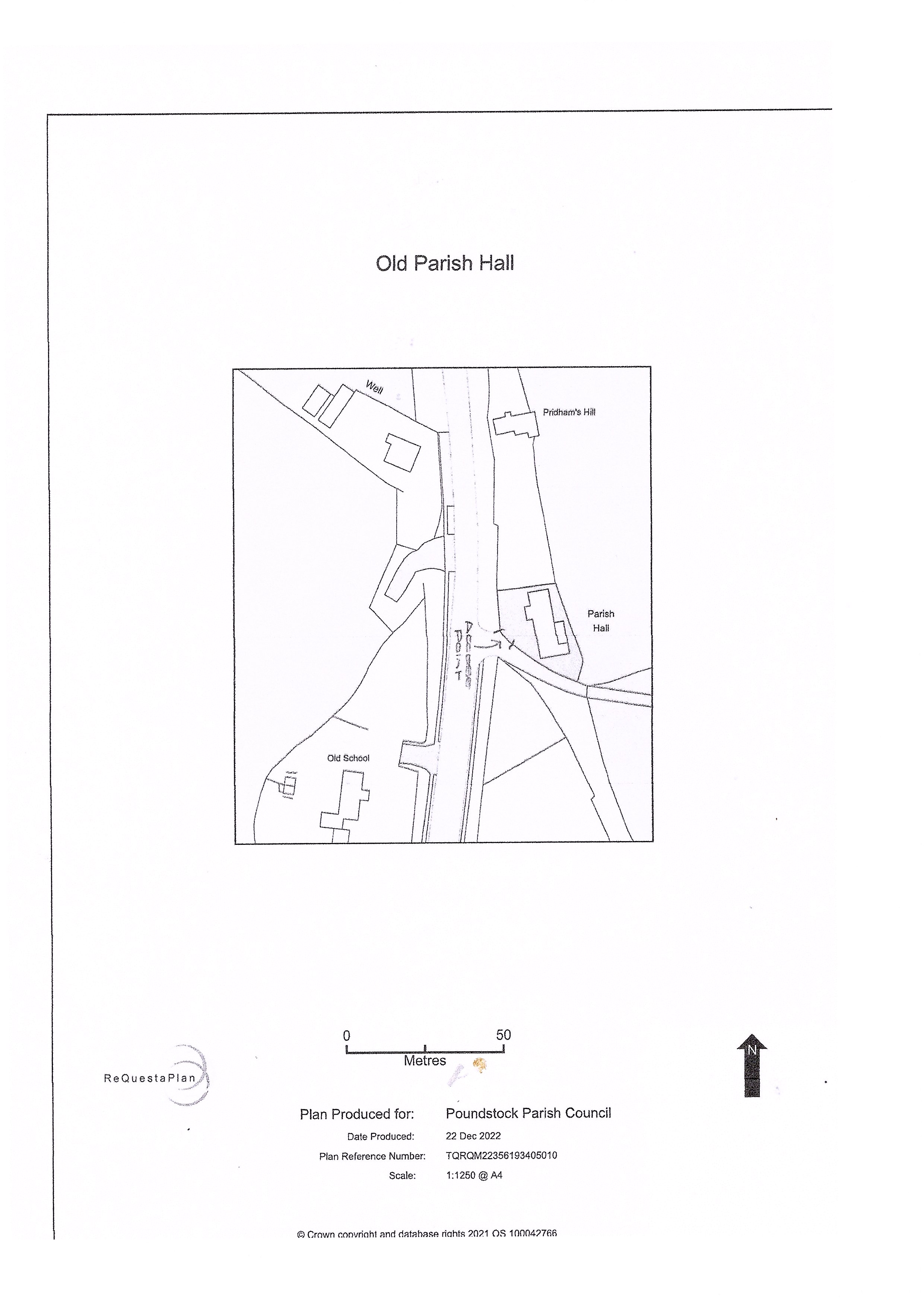 Planning permission: a grant of outline planning permission was approved on 31st March 2023 by Cornwall Council decision number: PA22/11476 for: to demolish the structurally condemned old Poundstock Parish Hall and replace with up to two residential dwellings.