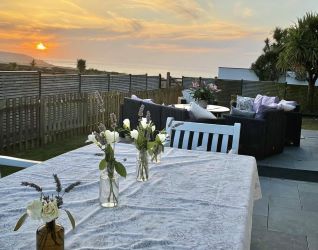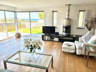The main house features a large dining room with solid oak flooring, a well-equipped kitchen with slate floors opening onto a courtyard garden, and a bright sitting room that captures sweeping views across the countryside towards Trevose Head and the Atlantic Ocean. There are five double bedrooms, including two en-suite rooms, plus a contemporary family bathroom.